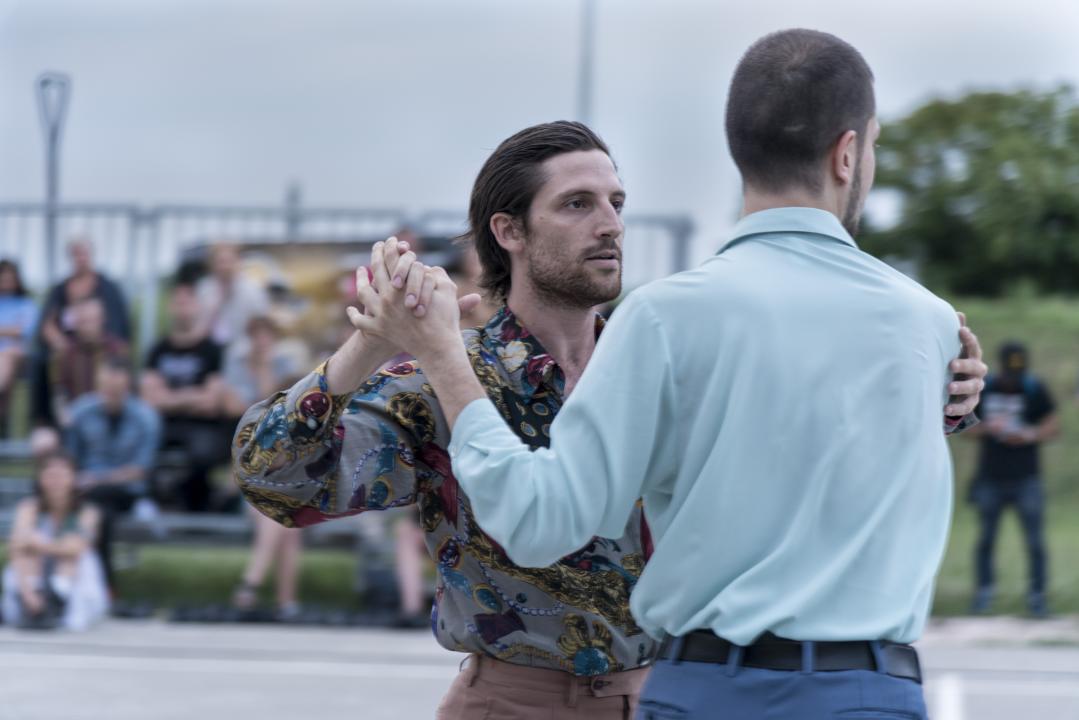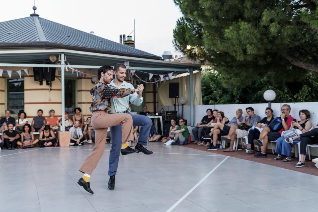 In Save the last dance for me Alessandro Sciarroni works together with the dancers Gianmaria Borzillo and Giovanfrancesco Giannini on the steps of a Bolognese dance called Polka Chinata. It is a courtship dance originally performed by men only and dating back to the early 1900s: physically demanding, almost acrobatic, it requires that the dancers embrace each other, whirl as they bend to their knees almost to the ground.